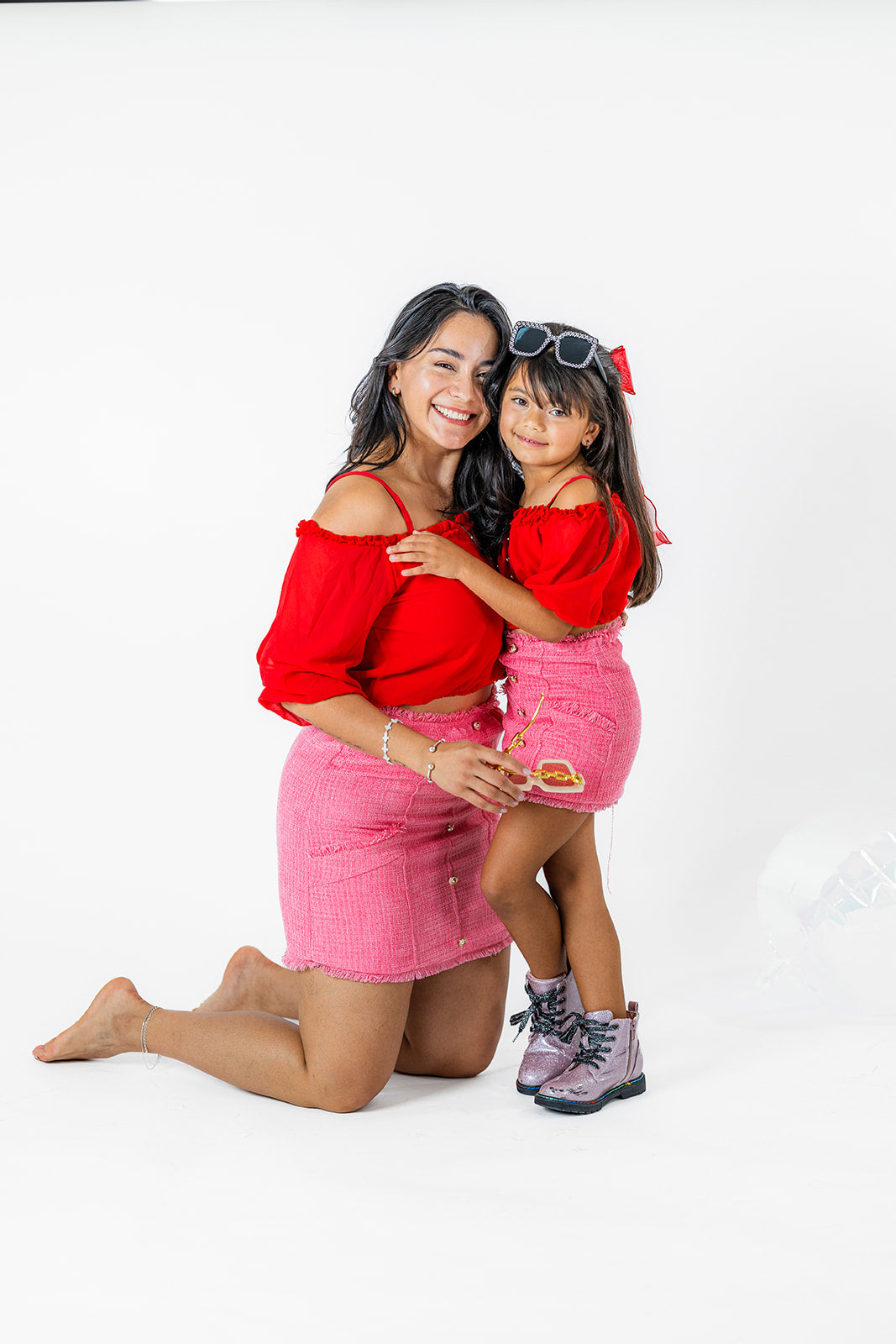 Women's Red Crop Top and Pink Boucle Skirt Set